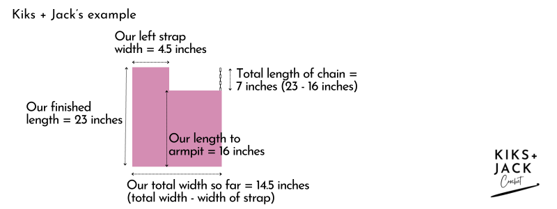 In Kiks + Jack example: Our Finished Length Measurement is 23 inches (85 chains). Our Length to Armpit Measurement is 16 inches (60 chains). Therefore after we have finished crocheting the neckline width we chain 7 inches (25 chains) to start crocheting the right strap.