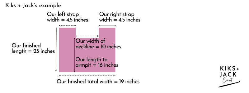 Kiks + Jack Crochet example: Our finished width measurement is 19 inches.  Our shoulder strap measurement is 4.5 inches.  We repeat rows 2 and 3 following our stripe pattern for 10 inches and the total width of our panel at this point is equal to 14.5 inches (19 inches โ€“ 4.5 inches).