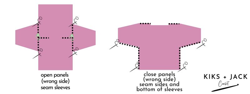 When everything is perfect, using a yarn needle and matching yarn, seam the sleeves to the main panels (wrong side facing up) โ see first diagram below (illustrative purposes only).